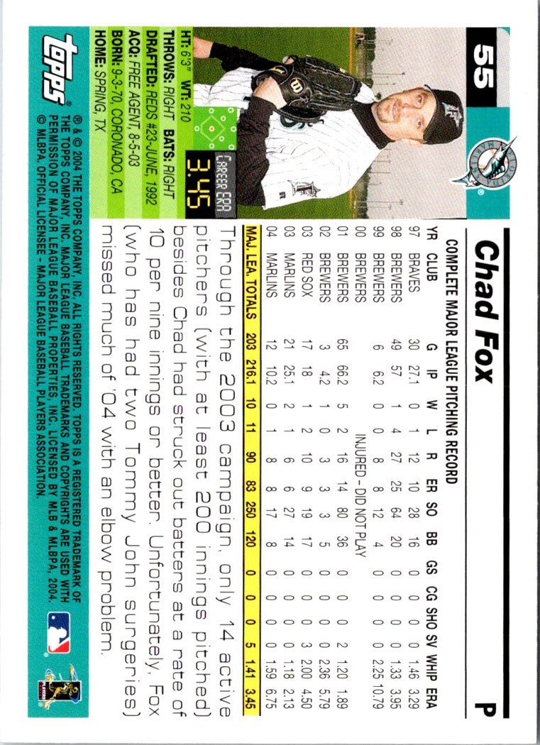 This 2005 Topps Chad Fox card celebrates the Florida Marlins reliever. Get your hands on this card featuring a full-color action shot of Fox on the mound. This card is a must-have for all Marlins fans, and a great addition to any baseball card collection. The card is in excellent condition and makes the perfect addition to any fan's memorabilia. Whether you're a long-time fan or just getting into the game, this card is sure to be a hit. Add it to your collection today!