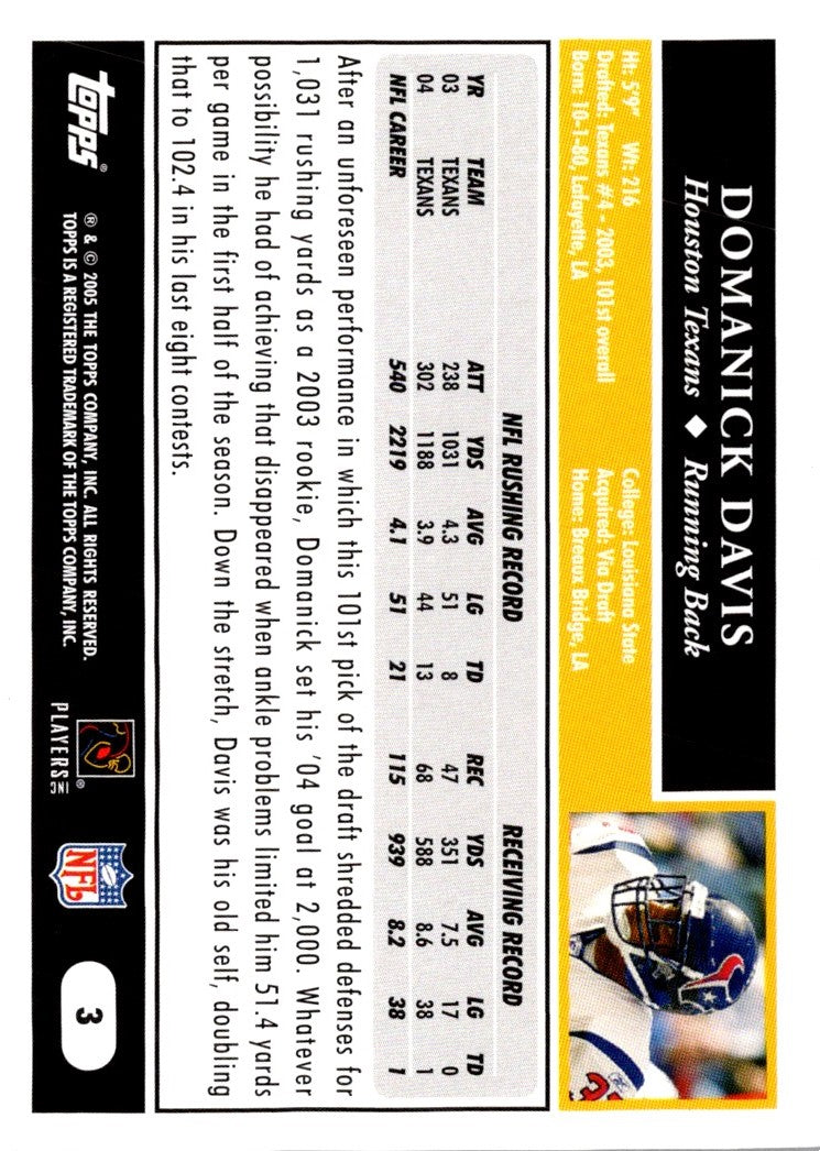 This 2005 Topps Domanick Davis #3Houston Texans card is the perfect addition to any NFL fan's collection. Featuring the former Texans running back in his uniform, this card will make a great addition to any memorabilia collection. The card's bright colors and sharp details make it a stand out piece for every fan. This card is a great way to honor the Texans' all-time leading rusher and remember his impact on the team. Add this card to your collection today and show your support for the former Texan!