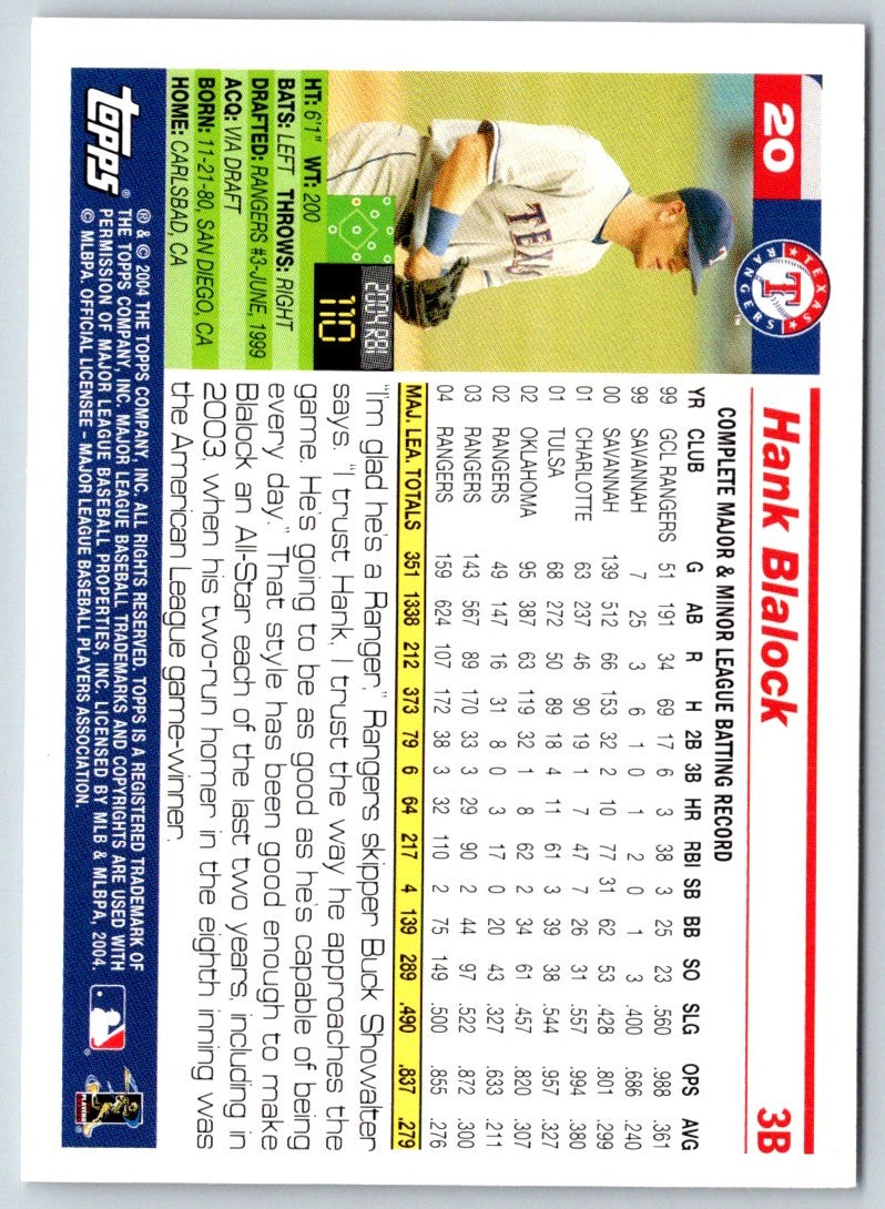 This 2005 Topps Hank Blalock #20 Texas Rangers card is a great addition to any fan's collection. Featuring a classic black and white team logo, the card has a glossy finish, adding a nice touch to the design. This card captures Hank Blalock in a great pose, in his Texas Rangers uniform. It's the perfect way to remember the great moments Blalock had with the Rangers. Get your hands on this great collectible today and add it to your collection.