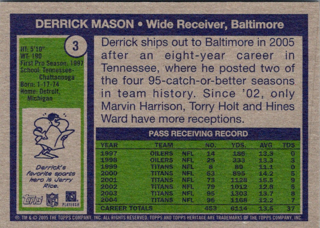 Description: 2005 Topps Heritage Derrick Mason #3
