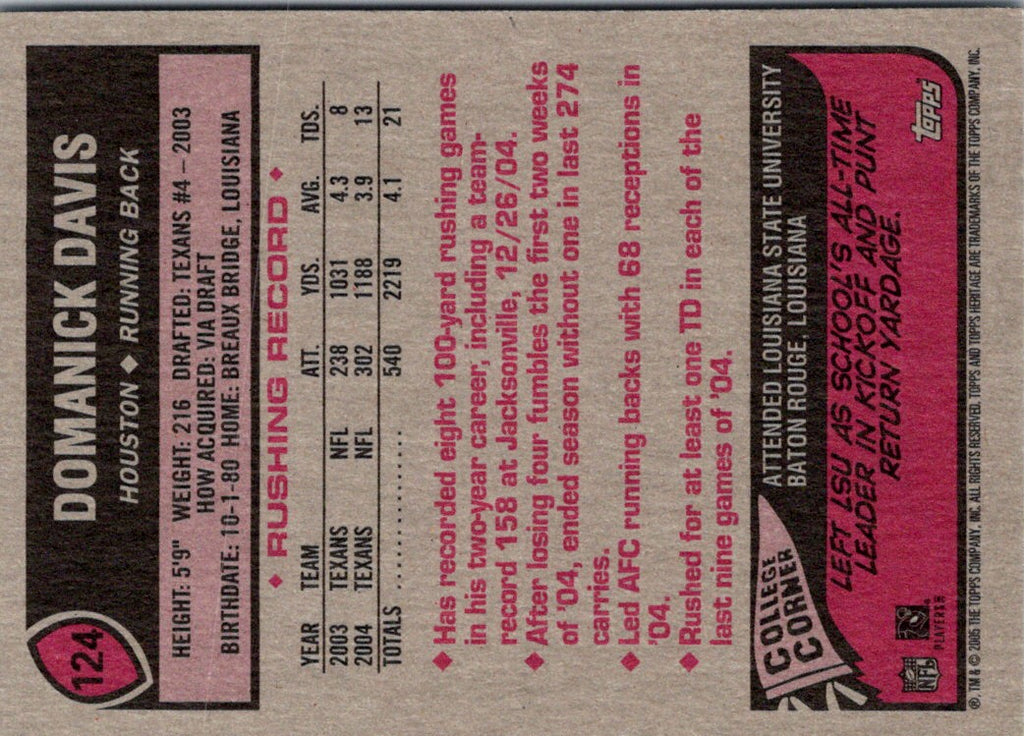 This 2005 Topps Heritage Domanick Davis #124 is a great addition to any Houston Texans fan's collection! Featuring a subtle design and the Texans' logo, this card is a great way to show off your team spirit. With a glossy finish and vibrant colors, it stands out from the rest. Plus, its classic design adds a sense of nostalgia to your collection. Get your hands on this card today and add a touch of history to your memorabilia.