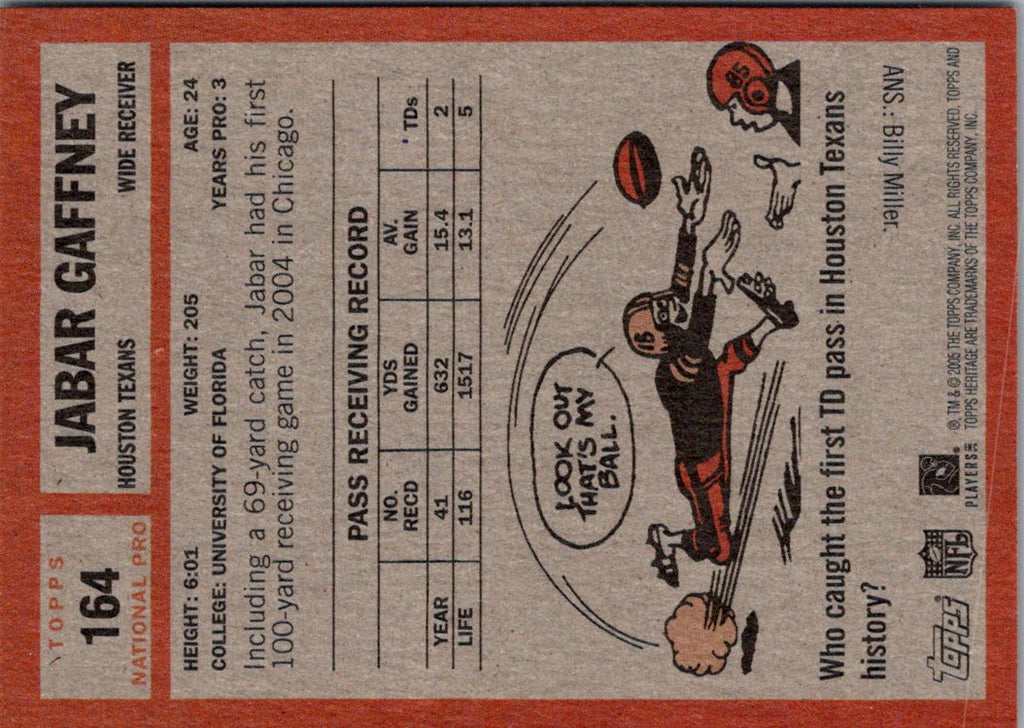Relive the greatness of the 2005 NFL season with this 2005 Topps Heritage Jabar Gaffney #164. Featuring a full-color image of Gaffney in his Houston Texans uniform, this card is a must-have for any fan of the star wide receiver. Boasting a high-grade centering and sharp edges, this card is also a great investment for any collector. Add this piece to your collection today and relive the excitement of the 2005 NFL season!