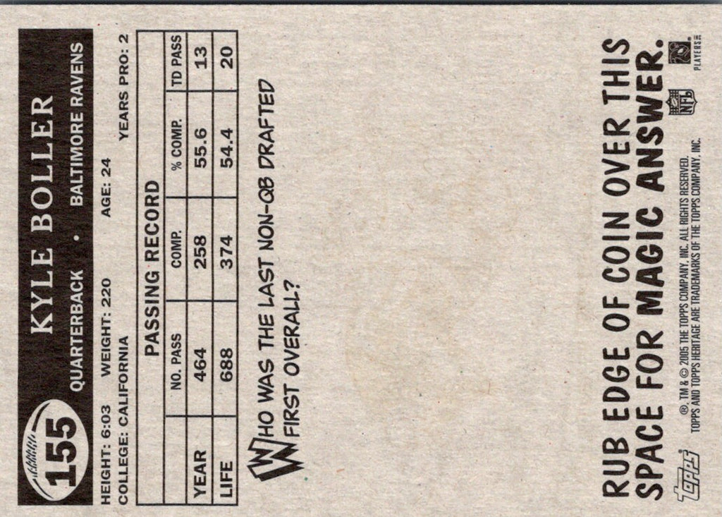 This 2005 Topps Heritage Kyle Boller #155 Baltimore Ravens card is a must-have for any Ravens fan! This card features a young Kyle Boller in his iconic No. 7 Ravens uniform. The card is in near-mint condition and will be a great addition to any collection. Show off your Baltimore Ravens pride with this classic card of one of the team's all-time greats!