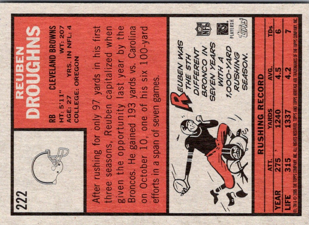 This 2005 Topps Heritage Reuben Droughns #222 Cleveland Browns card features an action shot of the Browns running back in his signature white uniform. The card is designed to match the classic 1952 Topps design, making it the perfect collectible for any Cleveland fan. The card is in near-mint condition and features a crisp, clear image of Droughns on the front. It is a great addition to any Browns or football fan's collection and is sure to become a treasured keepsake.