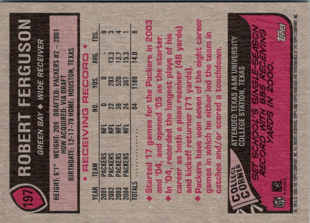 This 2005 Topps Heritage Robert Ferguson #197 card is a great addition to any Green Bay Packers fan's collection. Featuring a vibrant image of the wide receiver in action, this card is a perfect way to commemorate Ferguson's career with the team. The card is printed on a high-quality stock with a glossy finish, giving it a professional look and feel. A must-have for any Packers collector, this card is sure to become a prized item in any collection.