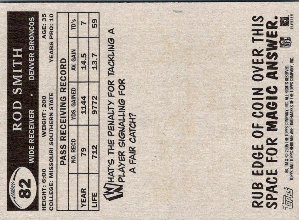 This 2005 Topps Heritage Rod Smith #82 card is a must-have for any Denver Broncos fan! This card features a full-color action shot of Smith on the field, making an impressive play. The back of the card features a brief biography and career stats. And with its iconic Topps Heritage design, this card will look great in any collection! Get your hands on this hard-to-find card before it's gone!