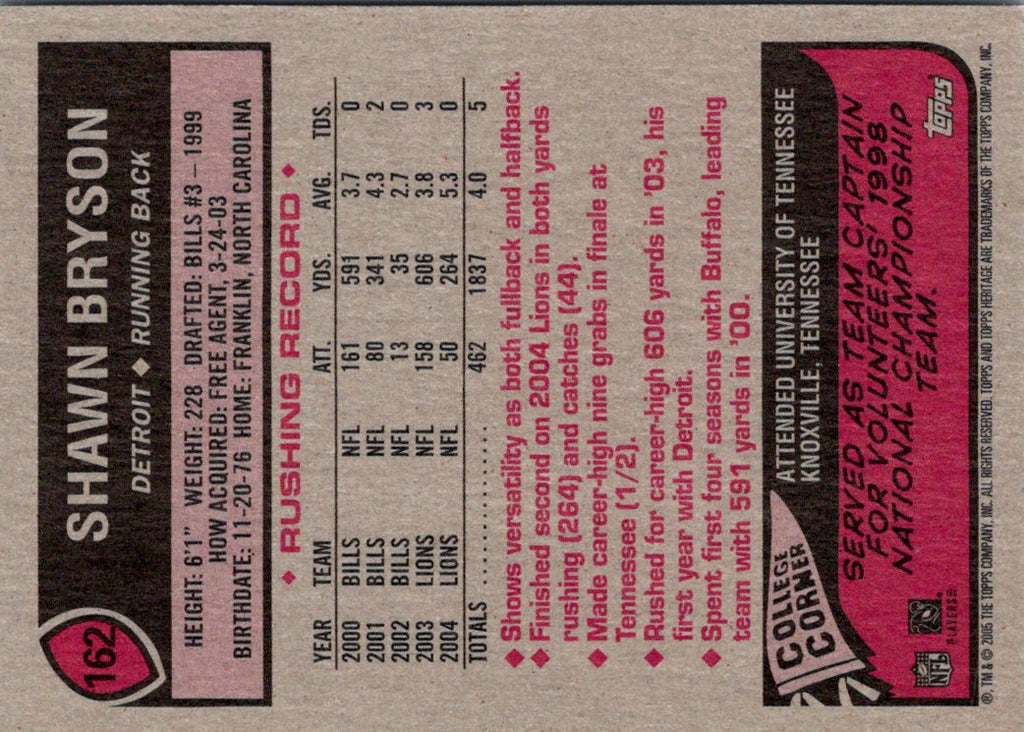 This 2005 Topps Heritage Shawn Bryson #162 card features the running back for the Detroit Lions in a classic design, perfect for any Lions fan. From the distinctive design of the card to the vivid colors, you can relive the history of the Lions each time you look at it. The card is a great way to show your team spirit and add to your collection. Be sure to add this unique card to your collection today!