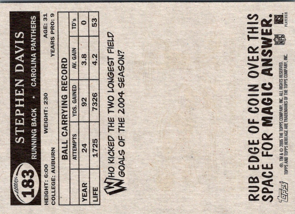 Relive the glory of the 2005 season with this Topps Heritage Stephen Davis #183 card! Featuring a classic design, this card captures the Panthers running back in mid-stride during a game. Show your Carolina Panthers pride and add a piece of history to your collection with this timeless card. Order now to guarantee that you have this piece of football history!
