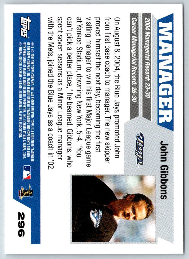 This 2005 Topps John Gibbons #296 Toronto Blue Jays card is a great addition to any collection. This card features a glossy, full-color image of Gibbons in his Blue Jays uniform, ready for action. The back of the card includes Gibbons' career stats, a brief biography, and a card number. It is perfect for any fan of the Toronto Blue Jays or John Gibbons, and a must-have for any baseball card collection. Add this 2005 Topps John Gibbons #296 Toronto Blue Jays card to your collection today!