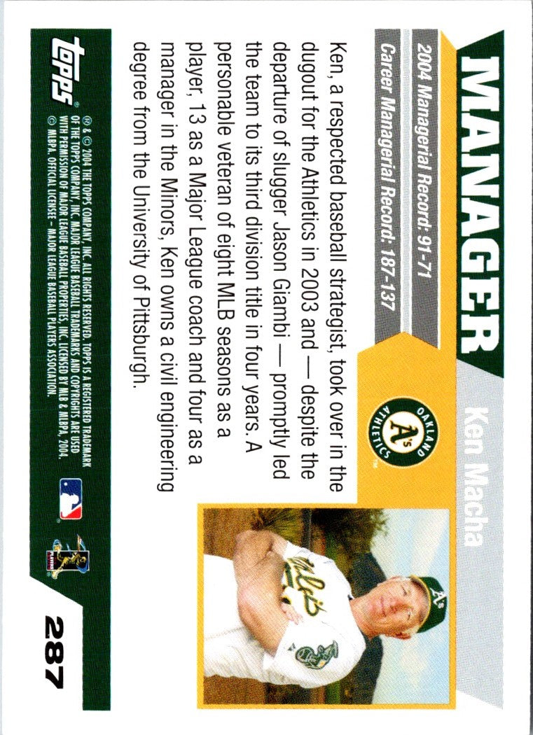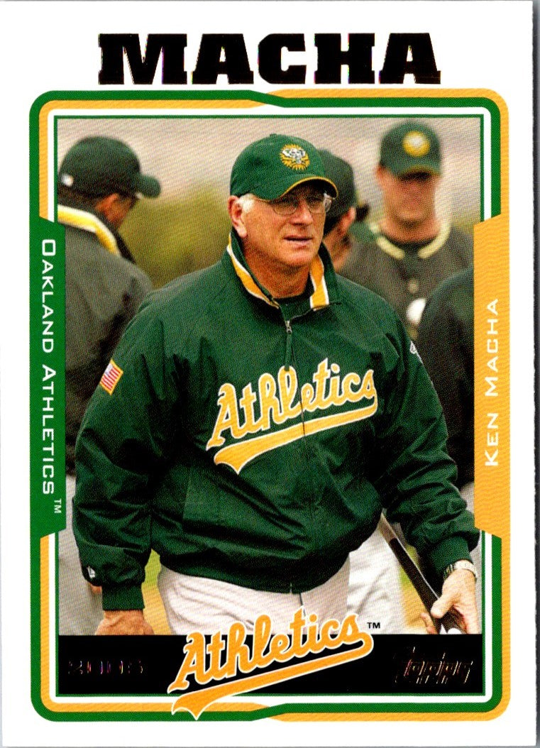 This 2005 Topps Ken Macha card is the perfect addition to your Oakland Athletics collection. This card features Macha in his iconic dugout pose, wearing the classic green and gold of the Athletics. It is a great commemorative piece for any fan of the A's or the MLB. With sharp, high-quality cardstock, this card is sure to last for years to come. Add this card to your collection and celebrate the legacy of Ken Macha!