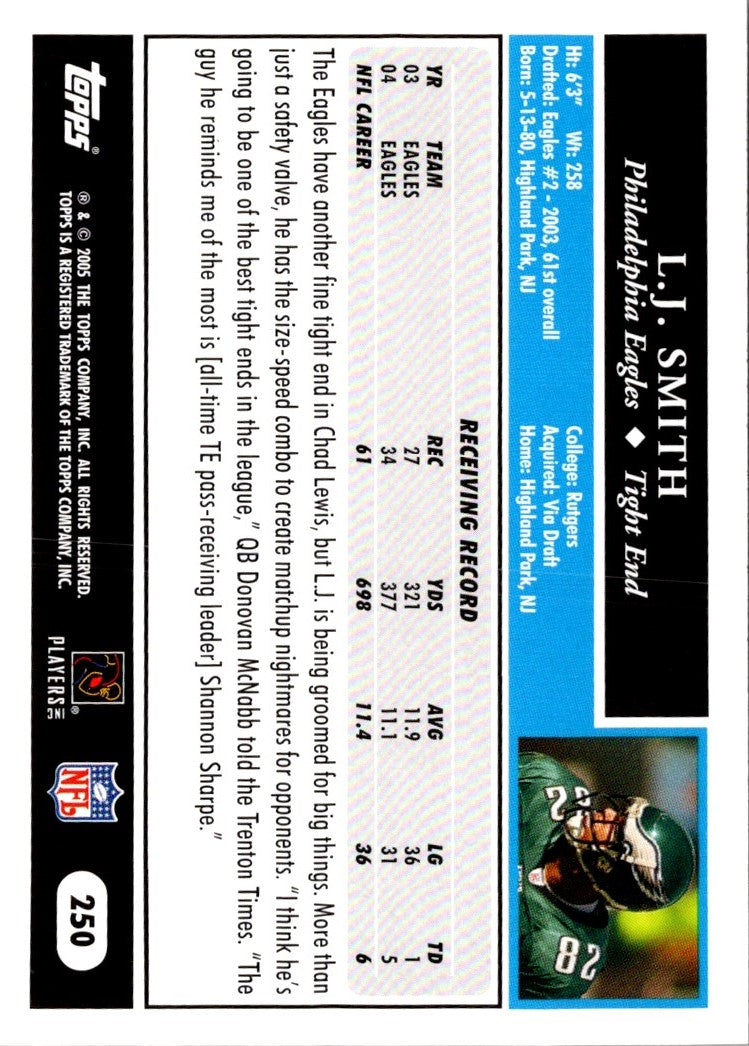 This 2005 Topps L.J. Smith #250 Philadelphia Eagles card is a great collectible for any Eagles fan. L.J. Smith was a quality Tight End for the Philadelphia Eagles from 2003-2008, and this card captures him in action in a stunning full-color image. It was printed on premium card stock and has a glossy finish. It is a must-have for any fan who wants to remember the glory days of the Eagles!