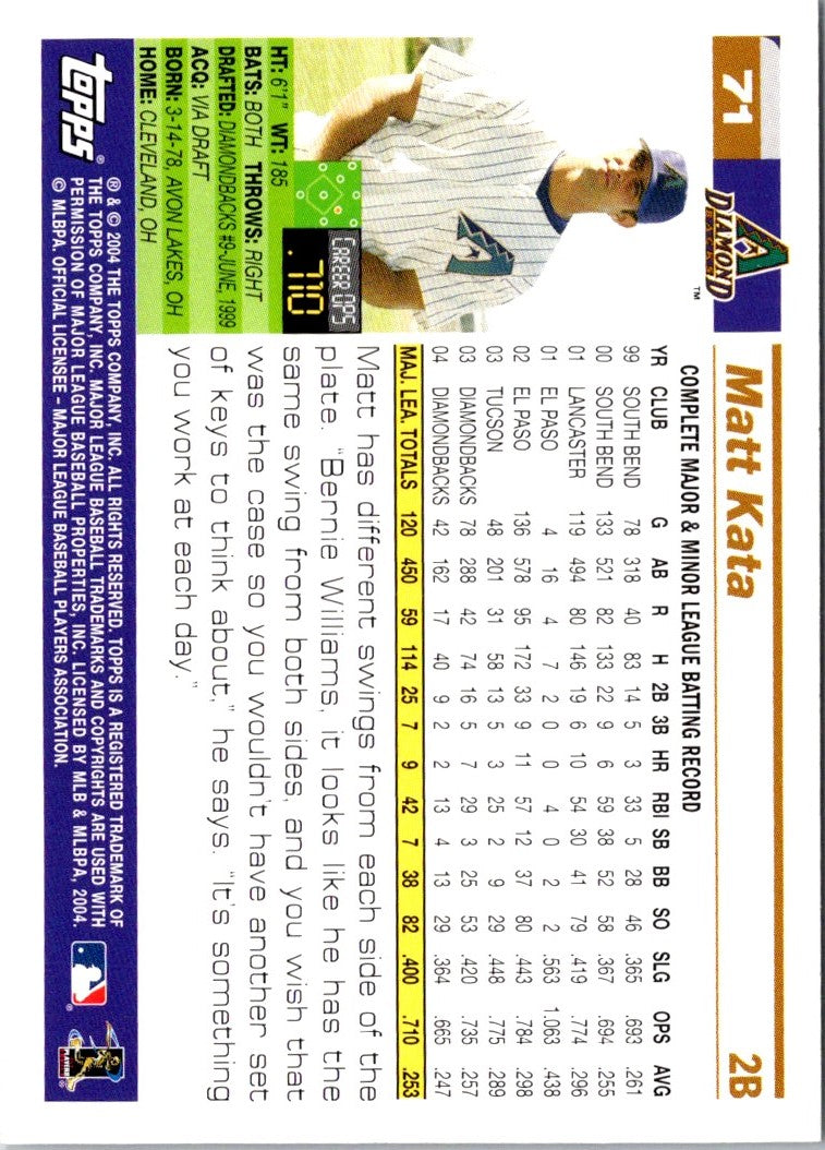2005 Topps Matt Kata #71 Arizona Diamondbacks card. This card features an action shot of Matt Kata in his Diamondbacks jersey, ready to swing. He is looking determined and focused, and you can almost feel the energy emanating from the card! This card is a must-have for any Diamondbacks fan, and a great addition to any baseball card collection. Get your hands on this card today and add it to your collection!