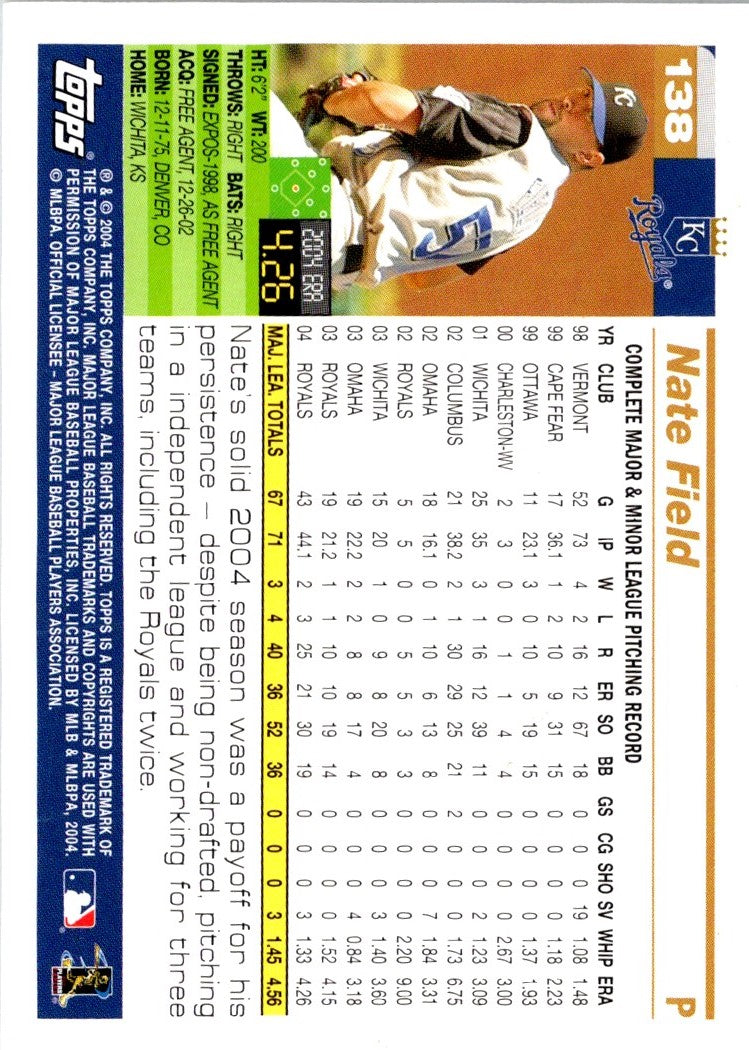 This 2005 Topps Nate Field #138 Kansas City Royals card is a great addition to any sports card collection! Featuring a glossy finish and high-quality photographic image, this card is sure to become a treasured keepsake for any Royals fan. The crisp, clear design and strong colors make it a great reminder of one of Royals' best players. Whether you're a casual fan or a collector, this card is a must-have for any Royals fan.