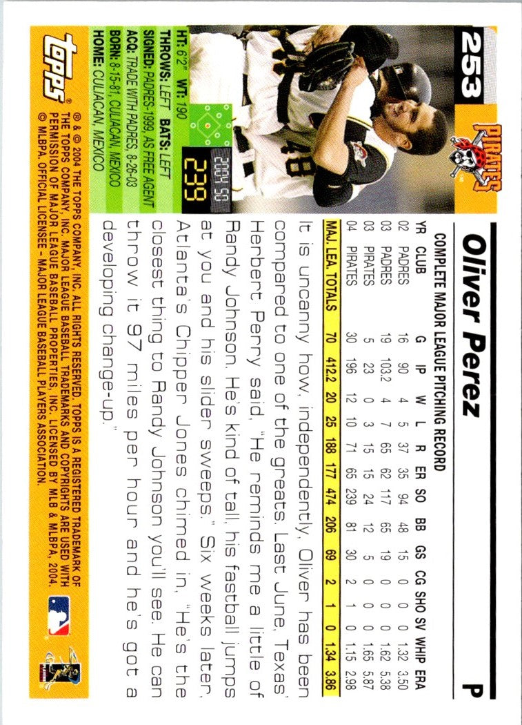 This 2005 Topps Oliver Perez #253 Pittsburgh Pirates card is a great addition to any fan's collection. Featuring a close-up action photo of Perez in his Pirates uniform, this card captures the intensity of the pitcher's performances. The back of the card features Perez's career stats and a biography, providing a comprehensive look at his career. Add this card to your collection and remember the great performances of one of the Pirates' all-time greats.