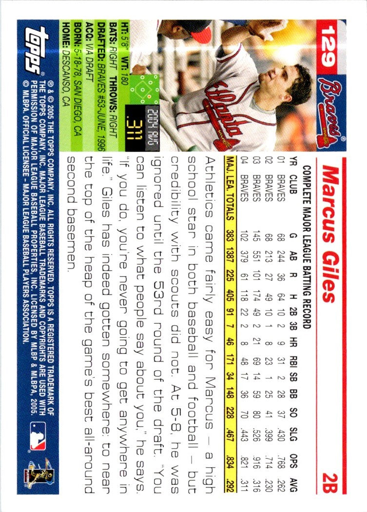 This 2005 Topps Opening Day Marcus Giles #129 card is a must-have for any Atlanta Braves fan. Featuring the All-Star second baseman in his full Braves uniform, this card captures Giles in action as he readies for the pitch. The card also features a detailed back giving fans a peek into his impressive career stats. Add this card to your collection today and celebrate the legacy of Marcus Giles with the Atlanta Braves.