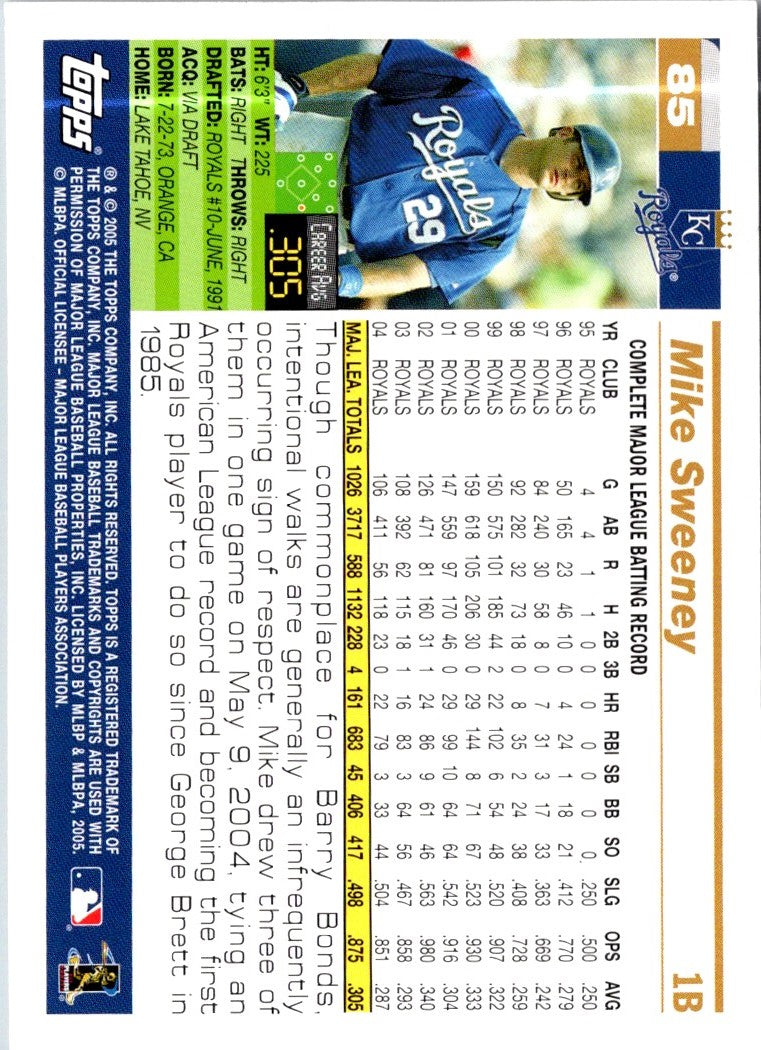 The 2005 Topps Opening Day Mike Sweeney #85 card is a must-have for any Kansas City Royals fan. Featuring an action shot of Sweeney in his blue Royals jersey, this card is perfect for any sports memorabilia collection. Sweeney, a five-time All-Star and two-time Silver Slugger Award winner, was an integral part of the Royals’ lineup during his tenure with the team. This card is sure to be a conversation starter. Add it to your collection today and celebrate the legacy of Mike Sweeney!