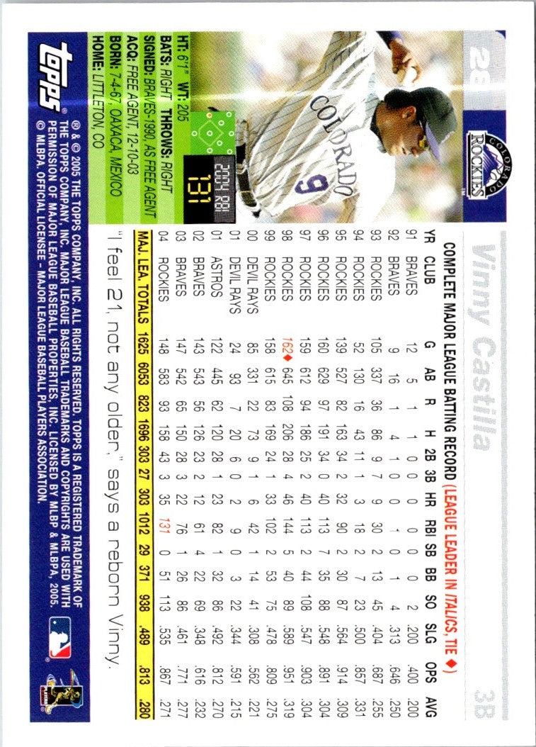 This 2005 Topps Opening Day Vinny Castilla #28 card pays homage to the Colorado Rockies infielder who was a fan favorite. Featuring Castilla in his Rockies batting stance, this card is an essential part of any Rockies fan's collection. With its unique design, crisp edges, and sharp corners, it is sure to bring a dose of nostalgia to any collection. Add this card to yours today and celebrate one of the best players in Rockies history.