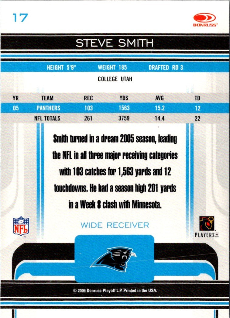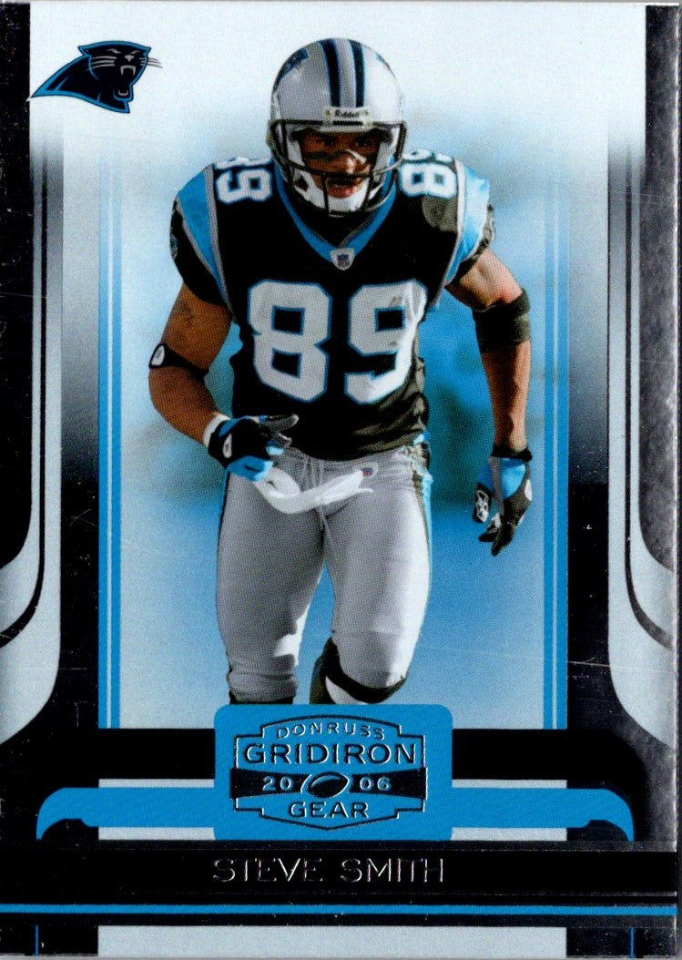 This 2006 Donruss Gridiron Gear Steve Smith #17 Carolina Panthers card is the perfect way to show off your Panthers pride. The card features a vibrant image of Smith in his Panthers uniform ready for action. This card truly captures the spirit of football as it features the classic Donruss Gridiron Gear design. Show your support for the Carolina Panthers and Steve Smith with this fantastic card.