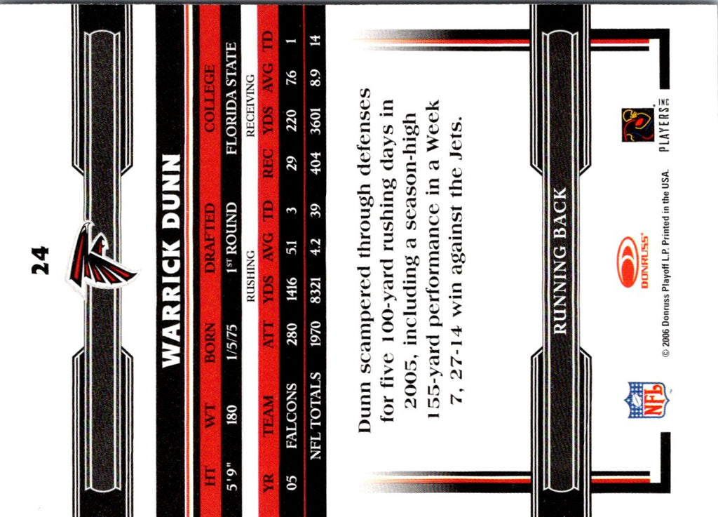 This 2006 Donruss Threads Warrick Dunn card #24 featuring the Atlanta Falcons running back is a must-have for any collector. This card features a full-color image of Dunn in action, with vibrant colors that make it stand out. The card also features detailed stats and key information about Dunn and his career with the Falcons. This card is a great way to honor one of the best running backs in the NFL and add to your collection. Don't miss out on this one!