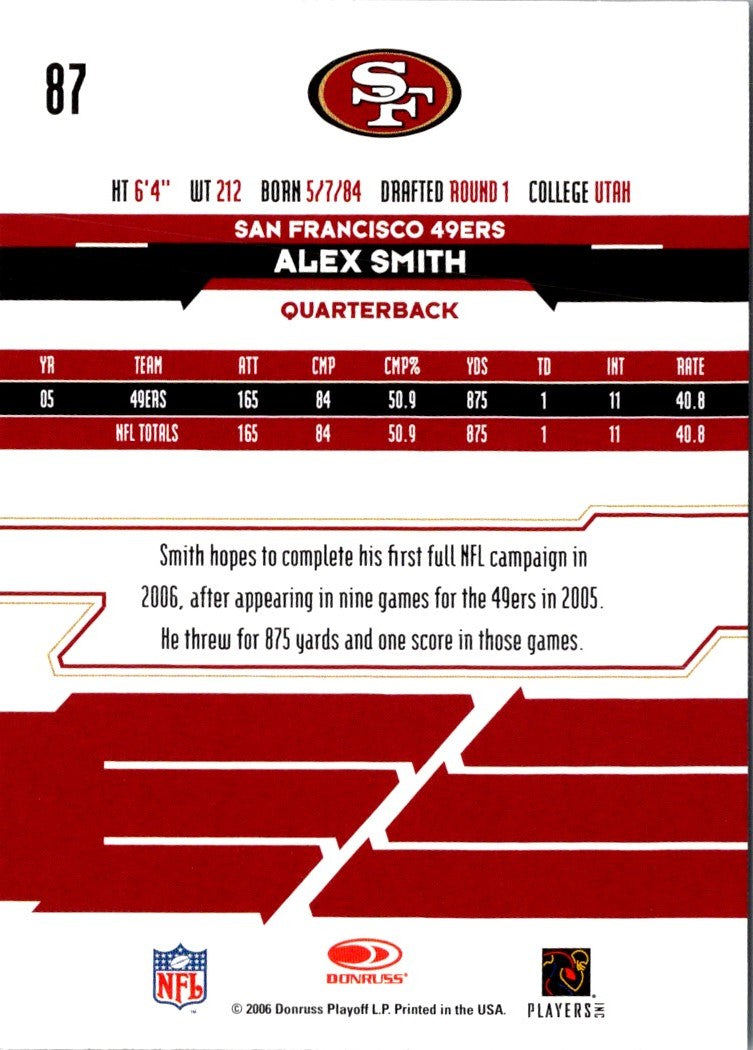 This 2006 Leaf Rookies & Stars Alex Smith card celebrates the quarterback's first year with the San Francisco 49ers. The card features a dynamic action shot of Smith in his Niners uniform, as he looks to make a play. Smith went on to be one of the most successful quarterbacks in the league, and this card is a great way to commemorate his rookie year with the 49ers. Add this card to your collection, and you will have a piece of NFL history.