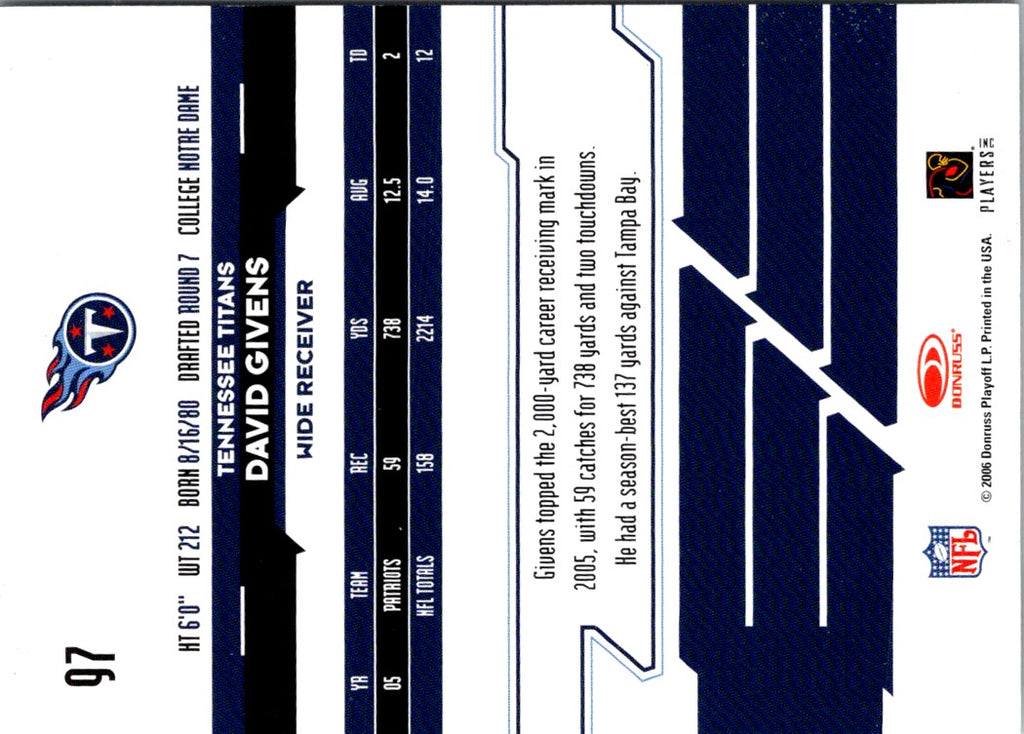 This 2006 Leaf Rookies & Stars David Givens #97 Tennessee Titans card is a must-have for any Titans fan! It features an action shot of Givens, wearing his Titans jersey and helmet, ready to make a play. The card is in mint condition and has been professionally graded, ensuring its authenticity. It is a great way to honor one of the Titans' all-time greats and is a must-have for any Titans fan. Add this card to your collection today!
