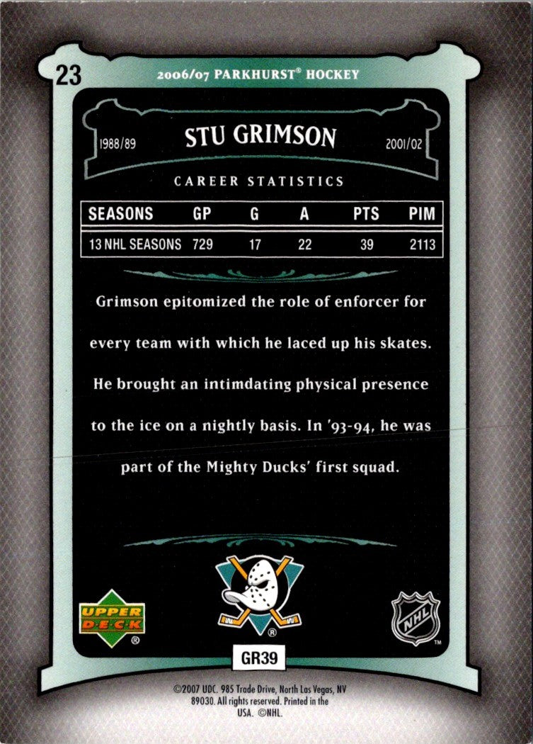This 2006 Parkhurst Stu Grimson #23 Anaheim Mighty Ducks card is a great collectible for any hockey fan! Featuring Grimson in action with the Ducks, this card is sure to be a great addition to any collection. With its vibrant colors and detailed design, this card is sure to be a conversation starter. Whether you're a Ducks fan or just looking to add to your collection, this card is a must-have!