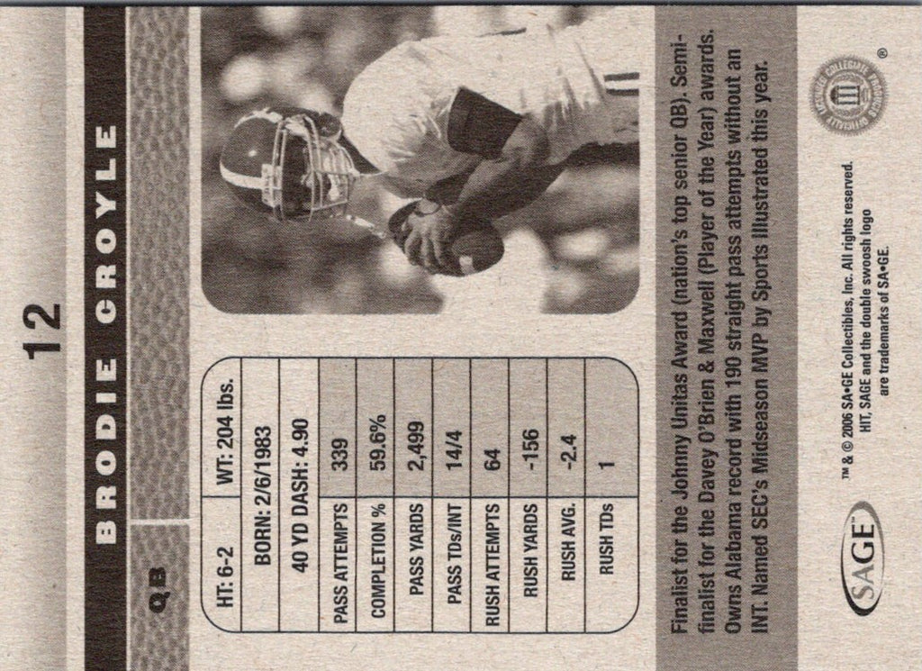 This 2006 SAGE HIT Brodie Croyle #12 Alabama Crimson Tide football card is the perfect addition to any Crimson Tide fan's collection. Featuring an action shot of the former standout quarterback, this card captures the excitement of one of the greatest college football programs in history. The card is printed on high-quality cardstock with a glossy finish, and features crisp, vibrant colors that will make it a great conversation piece. With its detailed design and imagery, this card is sure to be a hit!