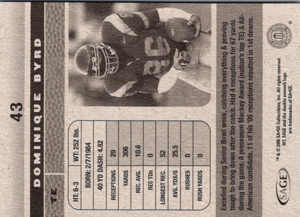 This 2006 SAGE HIT Dominique Byrd #43USC Trojans card is an absolute must-have for any Trojans fan or collector. The card features a vibrant image of Byrd in full USC uniform, with a crisp white background and bold colors. The card is also a great piece to add to any football memorabilia collection. Whether you're a fan of the Trojans, Byrd, or just football in general, this card is sure to please. Add it to your collection today and show your support for the Trojans!