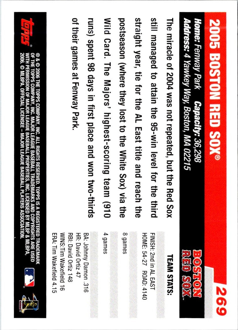 This 2006 Topps #269 Boston Red Sox card is sure to be a great addition to any collection! Featuring the iconic image of a Red Sox player, this card is perfect for any fan of the team. The card is made with high-quality materials, ensuring long-lasting durability. The vibrant colors make it stand out in any collection, making it a must-have for any fan of the Red Sox. With a low price point, this card is sure to be a great investment and will be sure to bring joy to any collector. Don't miss out on this great piece of Red Sox memorabilia!