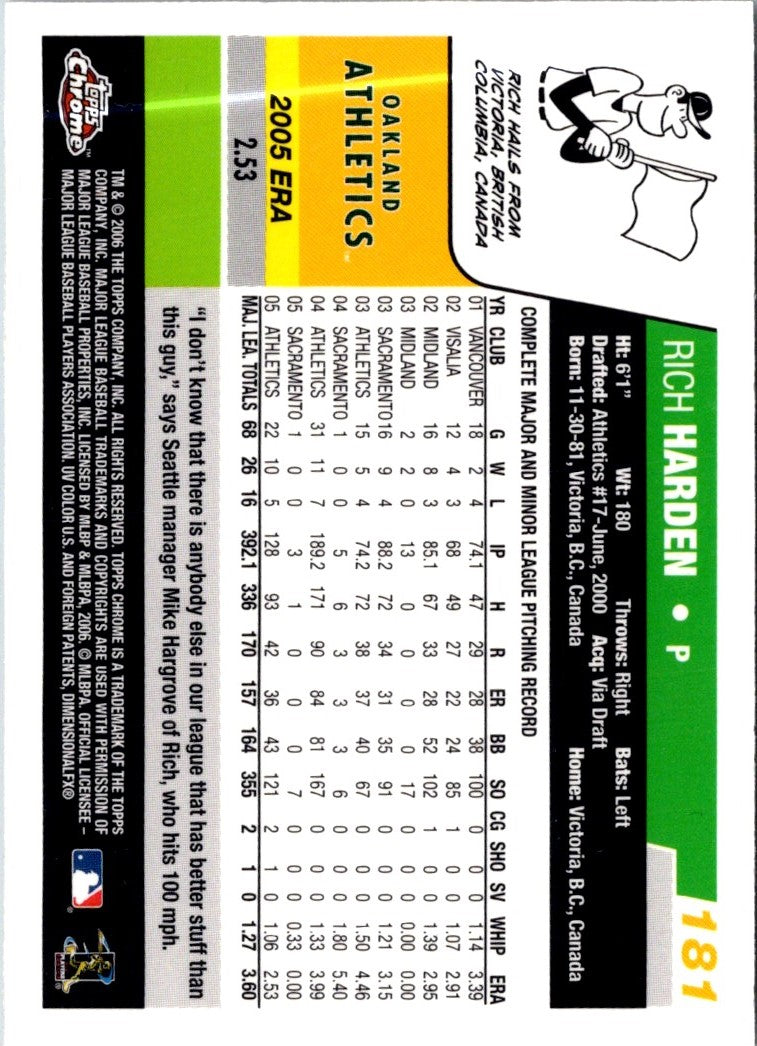 This 2006 Topps Chrome Rich Harden #181 is a must-have for any Oakland Athletics fan. Featuring a bold color photo of the pitcher in action, the card is sure to look great in any collection. It is made out of premium chrome stock that ensures long-lasting quality, so you can enjoy the card for years to come. Don't miss your chance to add this card to your collection and show off your Athletics pride.