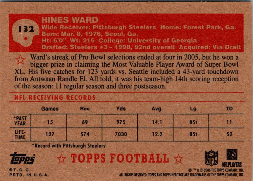 This 2006 Topps Heritage Hines Ward card features the iconic Steelers wide receiver in action on the gridiron. The vivid colors and sharp details of the image allow you to relive the excitement of the play. Every fan of Ward will want to add this card to their collection. It's a great way to show your support for the Steelers and honor Ward's impressive career.