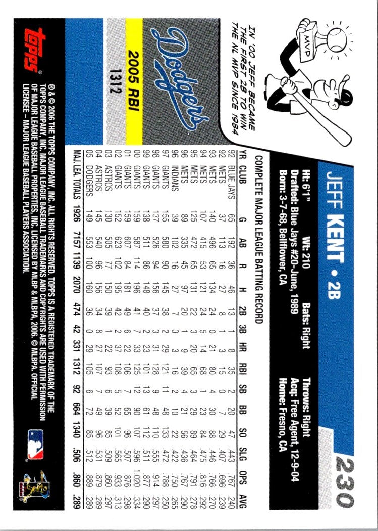2006 Topps Jeff Kent #230 from the Los Angeles Dodgers is a must-have for any baseball card, memorabilia, or Dodgers collection. This card features a detailed action shot of Kent mid-swing on the front, and his career stats on the back. It is a great piece of memorabilia to celebrate the Hall of Fame career of the 2000 NL MVP. Made with premium quality glossy card stock, it is sure to stay in pristine condition for years to come. Add one of the most decorated Dodgers of all time to your collection today!