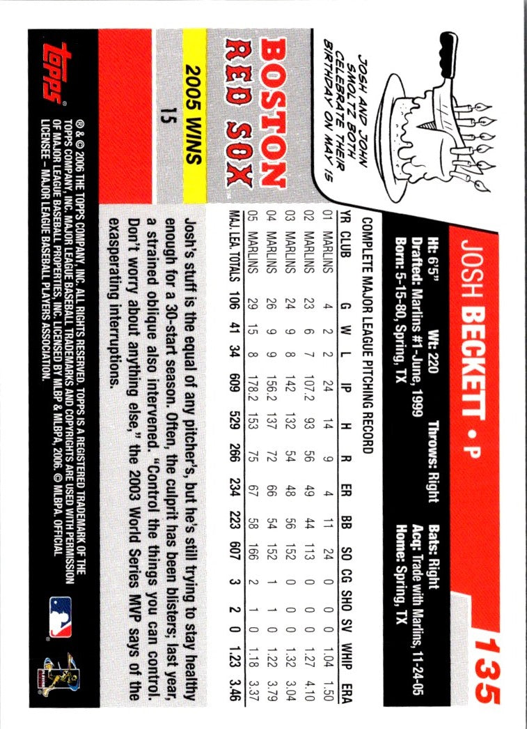 This 2006 Topps Josh Beckett #135 card is a great addition to any collector's set. Beckett is featured in his Boston Red Sox uniform in an action shot. The card is in mint condition, with bright colors and sharp corners. Beckett's career stats are listed on the back, making this card a great way to honor a great pitcher. Add this card to your collection and celebrate the career of one of the best pitchers in baseball.