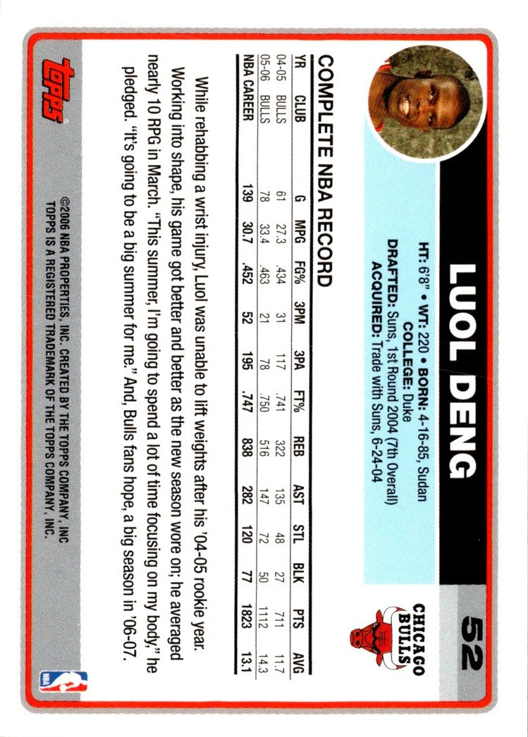 The 2006 Topps Luol Deng #52Chicago Bulls card is a must-have for any die-hard Bulls fan. This card features a vibrant image of Deng in a Bulls jersey, with bold colors that really bring the image to life. The card itself is printed on sturdy cardboard stock, making it a great collectible to add to any Bulls collection. This card is a must-have for any Bulls fan, and it'll look great in any Bulls collection.