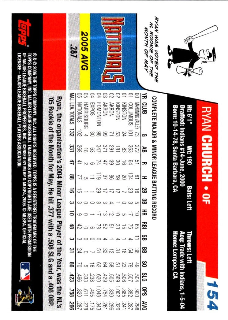 This 2006 Topps Ryan Church #154 Washington Nationals card is a great addition to any baseball card collection. Featuring a full-color action shot of Church in his Nationals uniform, this card is sure to please any Nationals fan. With the stats listed on the back, this card is an essential part of any Washington Nationals fan's collection. Don't miss out on your chance to own this card, and add it to your collection today!