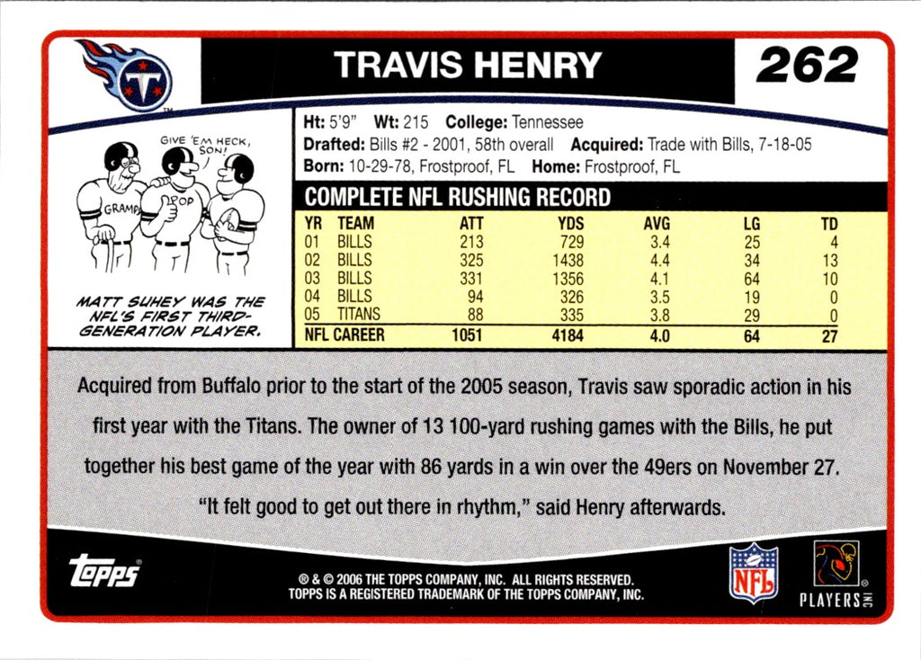 The 2006 Topps Travis Henry #262 is a must-have for any Tennessee Titans fan. This card features a dynamic action image of Henry in his Titans jersey, looking poised to take off on the next play. Henry was a key member of the Titans during his 4-year tenure, and is remembered fondly by fans and collectors alike. Add this card to your collection today and celebrate one of Tennessee's greatest running backs.