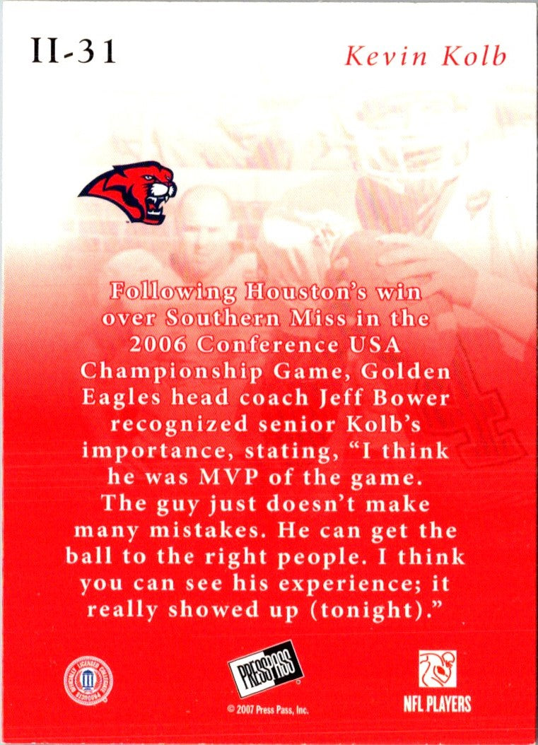 This 2007 Press Pass SE Insider Insight Kevin Kolb #II-31 card features the former Houston Cougars quarterback in a full-color action shot. This card is a must-have for any fan or collector of Kevin Kolb, or of the Houston Cougars! The card captures the moment of the quarterback in action and displays Kolb's number in high definition. It's a great way to honor the great achievements of Kolb during his college career. This card is a great addition to any collection and a great way to show your support for the Houston Cougars!