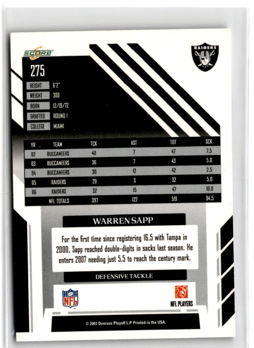 This 2007 Score Atomic Warren Sapp card #275 from the Oakland Raiders is a must-have for any NFL fan! Featuring a vibrant photograph of the Hall of Fame defensive tackle in action, this card is a great addition to any collection. It is a great way to show your appreciation for one of the most successful defensive linemen in NFL history. Get your hands on this piece of football history before it's gone!