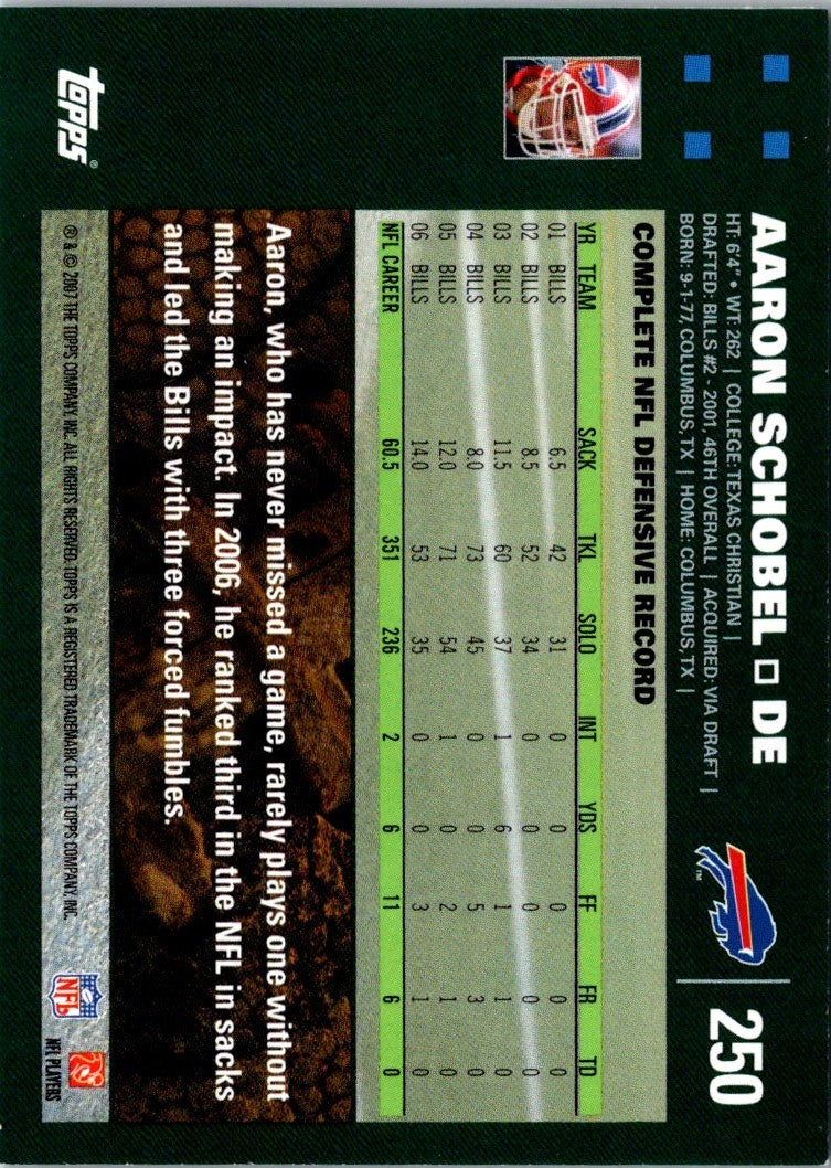 This 2007 Topps Aaron Schobel #250 Buffalo Bills card is a must-have for any die-hard sports fan. This card features a great action image of Aaron Schobel in his Buffalo Bills uniform, and the back of the card includes Schobel's career stats and highlights. This card is a great collectible piece for any fan, especially those who appreciate the great accomplishments of Aaron Schobel. Add this card to your collection and show your support for Aaron Schobel and the Buffalo Bills.