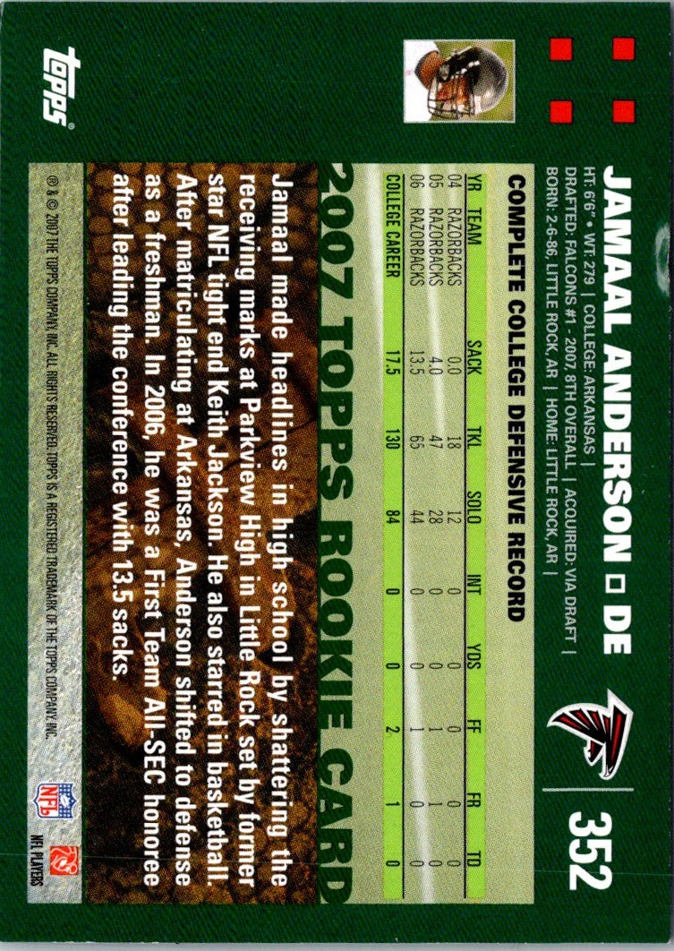 This 2007 Topps Chrome card of Atlanta Falcons Jamaal Anderson is a great addition to any football collection. Featuring a bold full-color action shot of Anderson in his Falcons jersey, this card is sure to bring you closer to the action. On the reverse side, you'll find detailed stats and career highlights. This card is sure to make a great addition to any Atlanta Falcons fan's collection. Get your hands on this one-of-a-kind card today!