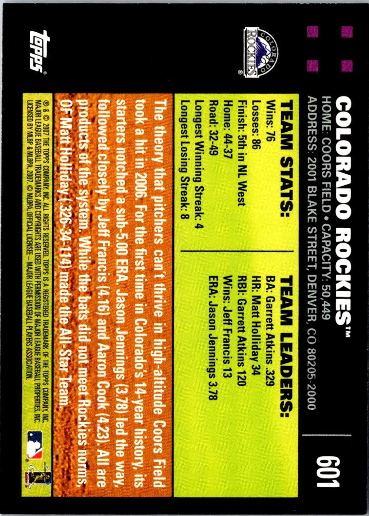 This 2007 Topps Colorado Rockies #601 card is a great addition to any fan's collection. It features a full-color image of one of the Rockies' top players, plus stats and information about the team. It's a must-have for any Rockies fan, or anyone who collects Topps baseball cards. The card is printed on quality stock and glossy, making it durable and a pleasure to look at. With this card in your collection, you can show your Rockies spirit and add to your card collection.