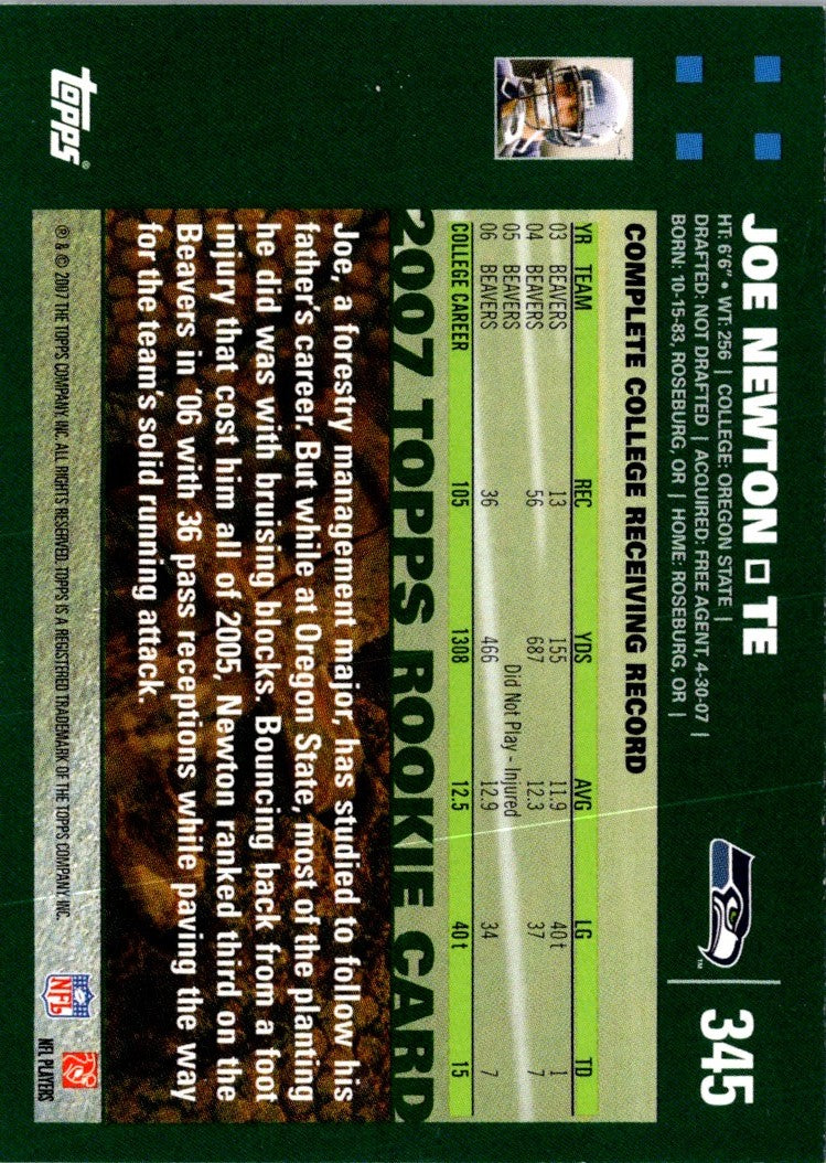 This 2007 Topps Joe Newton #345 Seattle Seahawks card is a must-have for any serious football fan! Featuring a crisp, clear image of Newton in his Seattle Seahawks uniform, this card is sure to be a prized possession of any collector. With its unique design and iconic logo, the card is sure to draw attention from fellow collectors and fans alike, and its durable construction ensures that it will last for years to come. Whether you're looking to complete your collection or just want to show your Seahawks pride, this Joe Newton #345 card is the perfect choice!