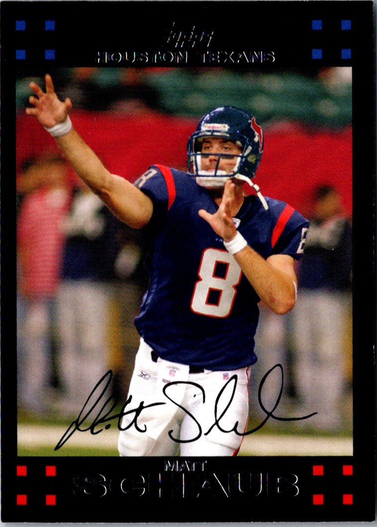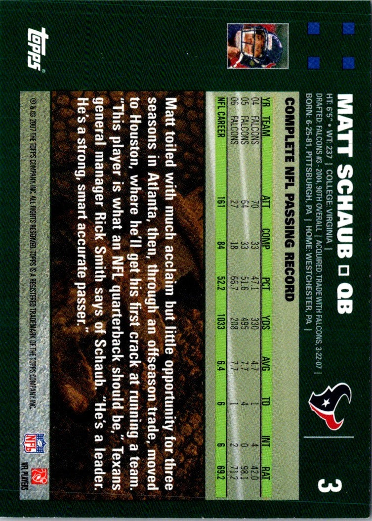2007 Topps Matt Schaub #3 is the perfect addition to any Houston Texans fan's collection! This card features an action shot of Matt Schaub in Texans blue and red, ready to make a play. On the back of the card, you'll find Schaub's career stats and highlights. It's the perfect way to commemorate the rise of the Texans and Schaub's long career with the team. Add this card to your collection today and show off your Texans pride!
