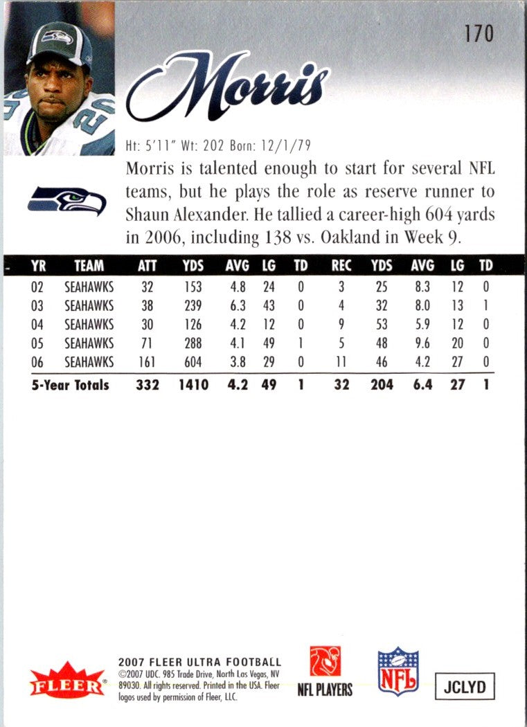 This 2007 Ultra Maurice Morris #170 Seattle Seahawks card is an essential piece for any serious collector. Not only does it feature a high-quality image of Morris in action on the field, but it also features a detailed statistical breakdown of his performance. The perfect addition to any card collection, this card is sure to bring a touch of style and class to any fan's display. With its bold colors and crisp design, this card is sure to become a conversation piece. Show off your love for the Seattle Seahawks and Maurice Morris with this 2007 Ultra Maurice Morris #170 card!