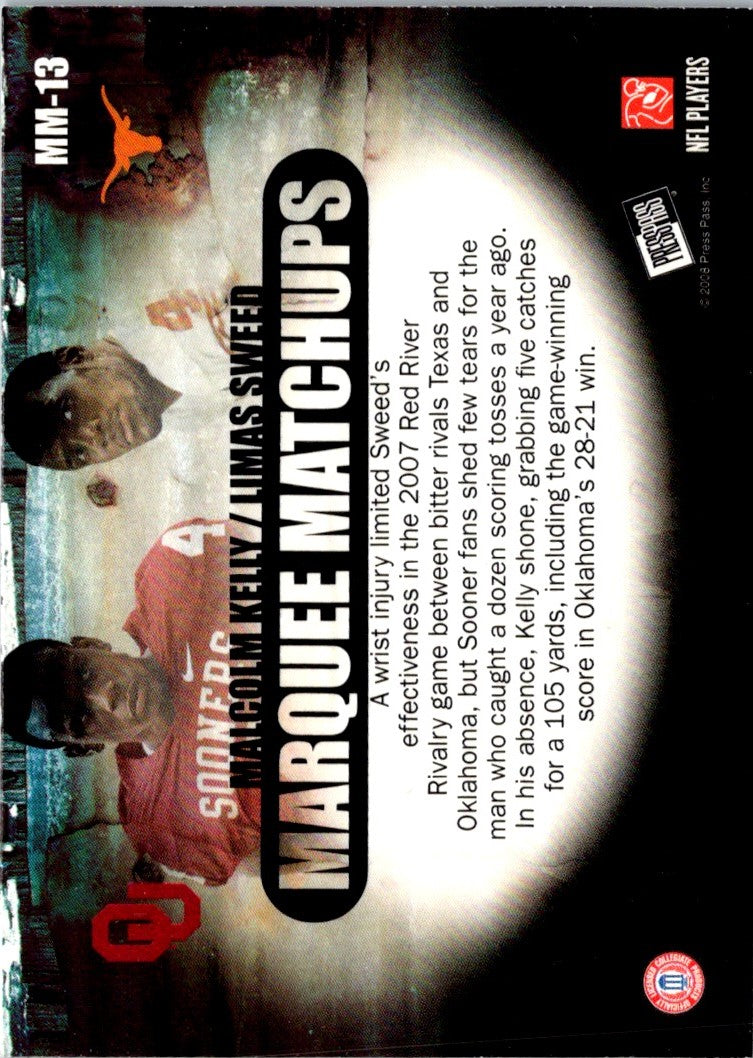 The 2008 Press Pass SE Marquee Matchups Malcolm Kelly/Limas Sweed #MM-13 Oklahoma Sooners/Texas Longhorns card is a must-have for any fan of college football! This special edition card is a great way to commemorate the classic rivalry between two of the most successful college football teams. Featuring two of the biggest stars of the time, Malcolm Kelly and Limas Sweed, this card is sure to become a cherished item in any collection. This card is a great way to show your support for your favorite teams and players!