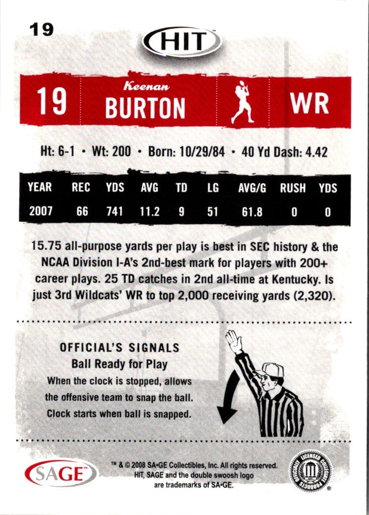 This 2008 SAGE HIT Keenan Burton #19 Kentucky Wildcats card is a great addition to any sports memorabilia collection. Featuring high-resolution photography of Burton and the Wildcats logo, this card is sure to make any fan’s day. The card is encased in durable plastic to ensure it will last for years to come. Its vibrant colors are sure to make it stand out in any collection. Show your support for the Wildcats and grab this card today!