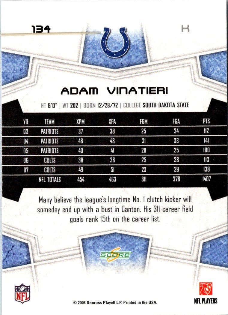 Adam Vinatieri is one of the most decorated kickers in NFL history. With a career spanning over two decades, he has earned four Super Bowl rings, three Pro Bowl selections, and is the all-time leader in points scored. His 2008 Score card is a must-have for any NFL fan looking to add a piece of history to their collection. This card features a full-color action shot of Vinatieri in his Colts uniform, and a detailed profile of his career highlights. It's a great way to show your admiration for one of the greatest kickers of all time.