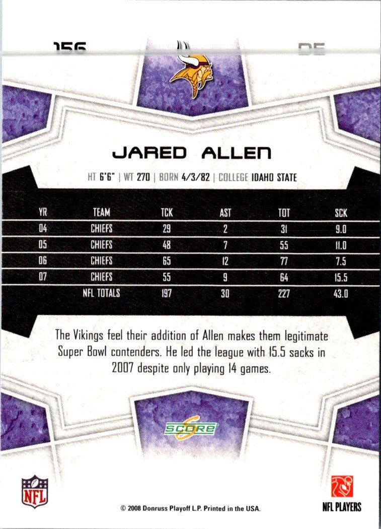 This 2008 Score Super Bowl XLIII Jared Allen #156 Minnesota Vikings card is a must-have for all serious Vikings fans! Show off your team pride with a card featuring Jared Allen, a defensive end who was selected to the Pro Bowl four times. This card is printed on quality card stock, and features a full-color action photo of Allen in his Vikings uniform. Get this card now and commemorate one of the greats of the Minnesota Vikings!