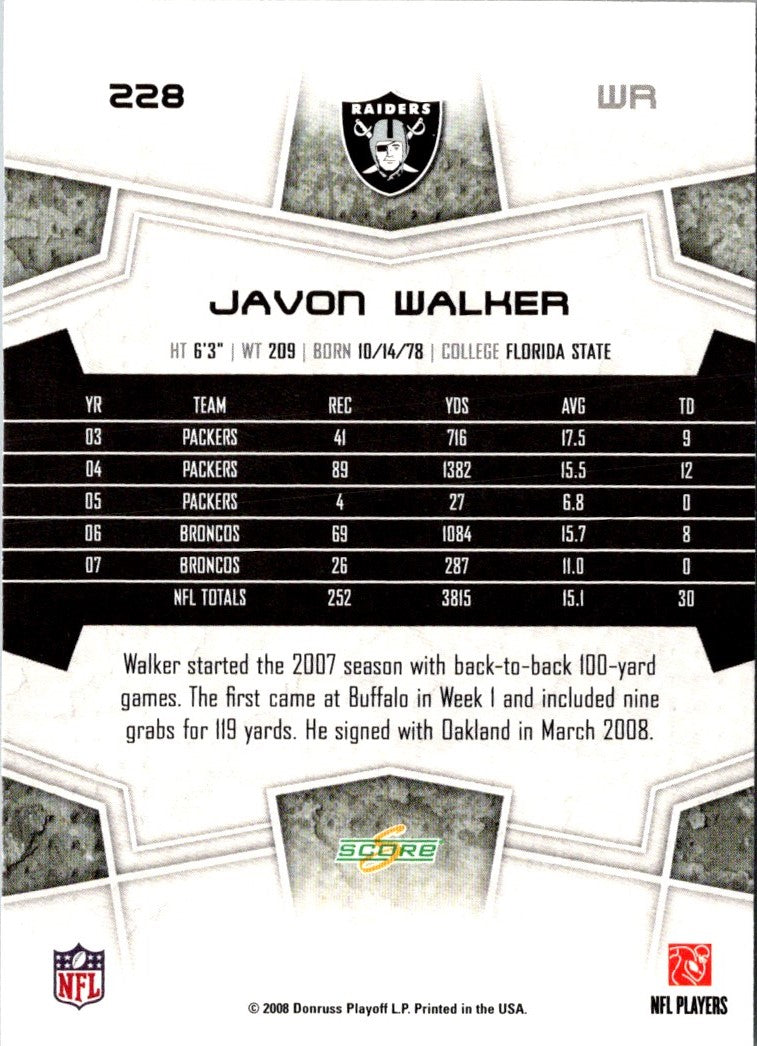 Score Super Bowl XLIII Javon Walker #228Oakland Raiders card is an essential addition to any football fan's collection. This card features a stunning action shot of the legendary Oakland Raiders wide receiver in his iconic black and silver uniform. The reverse side of the card showcases Walker's career highlights, awards, and stats, allowing you to relive one of the greatest moments in Raiders history. This card is perfect for any fan looking to honor the legacy of one of the NFL's most beloved players and the greatest football team of all time.