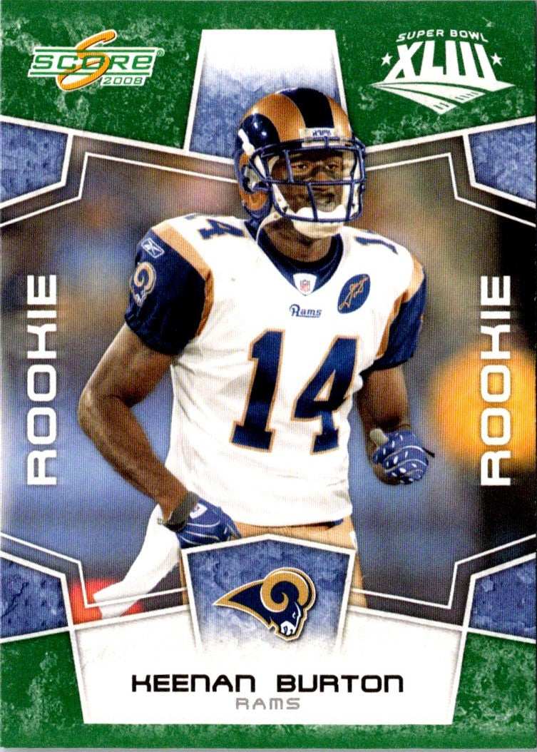 This 2008 Score Super Bowl XLIII Keenan Burton card #405 is the perfect addition to any St. Louis Rams collection. The card features a portrait of Burton in his iconic Rams uniform, along with his name, team, and position. This card captures the moment Burton made an impact on the Rams, making him a great addition to any fan's collection. Commemorate the great Keenan Burton's career with this timeless card. Add it to your collection today!